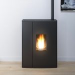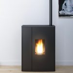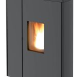 Pelletofen, der sich besonders bei Platzproblemen eignet. Kanalisierbarer Luftfluss. Vorderteil aus schwarz lackiertem Stahl.