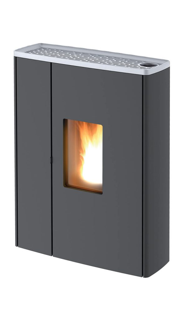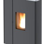 Pelletofen, der sich besonders bei Platzproblemen eignet. Kanalisierbarer Luftfluss. Vorderteil aus schwarz lackiertem Stahl.